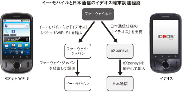 ファーウェイの日本代理店であるファーウェイ・ジャパン経由で端末を調達したイー・モバイルが、香港のファーウェイ本社から代理店(英eXpansys社)経由で仕入れた日本通信の「イデオス」の販売を中止するよう求めたのが発端。これだけなら、よくある総代理店と並行輸入のトラブルなのだが、電波法の端末認証に絡んで総務省が乗り出す話になってしまった。