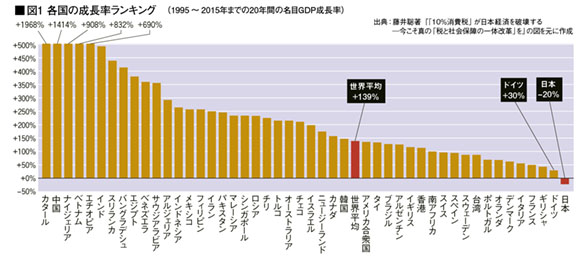これは、1995年から2015年までの20年間の経済成長率(名目GDP=国内総生産の変化率)の各国比較である。日本だけが経済成長を止めているのが、一目瞭然だ。しかも、日本は20年に及ぶデフレであり、このような長期のデフレは、世界にも類を見ない。第2次世界大戦後、「奇跡」と呼ばれた経済成長を成し遂げた国が、90年代半ばを境として、突然、このような無残なパフォーマンスしか出せなくなった。なぜ、こうなってしまったのか――。