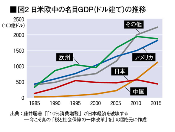 しばしば、「日本は成熟社会だから、もう経済成長は望めない」だの「少子高齢化社会だから、経済成長はできない」だのと、したり顔で語る人がいる。しかし、欧米の成熟した先進諸国と比較しても、日本だけが突出して成長していない。さらに言えば、90年代半ばを境に、日本だけが、突然、折れたかのように、成長が止まっている(図2)。これほど極端な現象は、社会の成熟、産業構造の変化、あるいは人口動態といった構造的な要因では、説明できない。