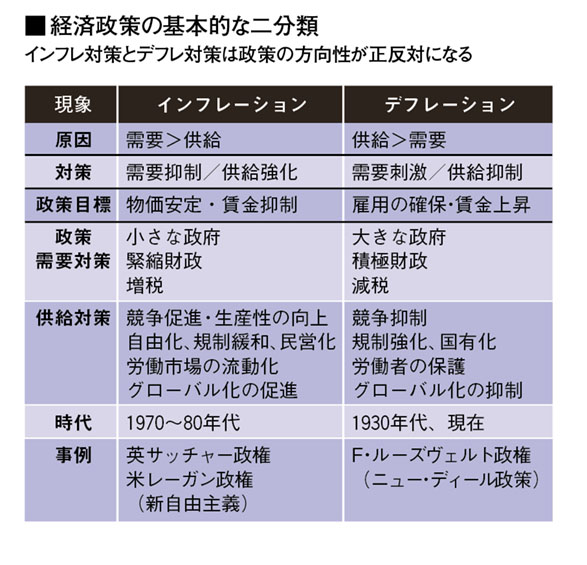 この正反対の対策は、次のようにも言い換えられる。インフレ対策とは、政府が「需要抑制/供給促進」政策によって、人為的にデフレを引き起こすこと。反対に、デフレ対策とは、政府が「需要拡大/供給抑制」政策によって、人為的にインフレを引き起こすことである、と。
